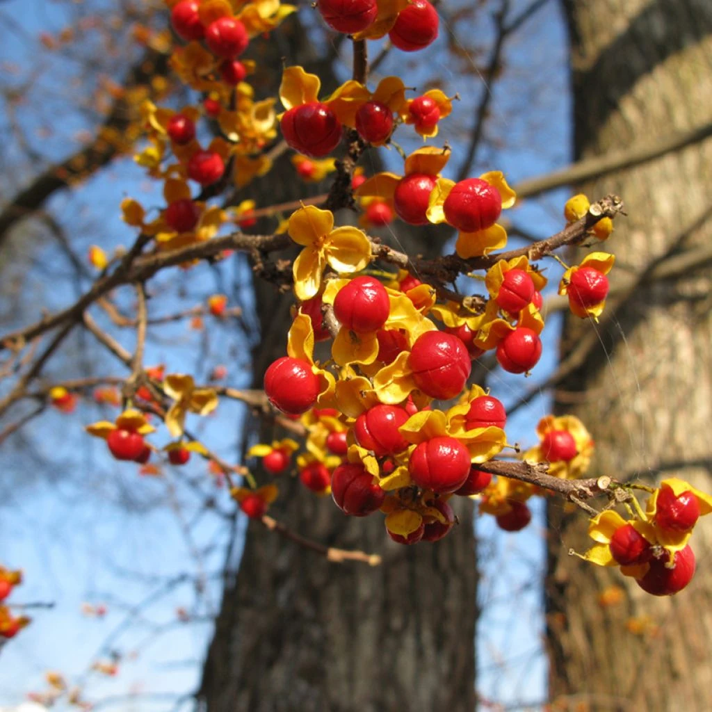 Le Celastrus orbiculatus Diana est un vigoureux arbuste grimpant, aux tiges volubiles, dont la généreuse fructification reste décorative depuis la fin de l’été jusque tard en saison. Ces fruits sont réunis en petites grappes bicolores, les capsules jaunes s’ouvrant sur une perle rouge-orangé. Ces jolis fruits vous assureront la visite des oiseaux qui en raffolent, mais ne les imitez pas, la graine est toxique. Le feuillage, caduc, prend une belle teinte jaune en automne. ‘Diana’ est un bourreau des arbres femelle qui nécessite la présence d’un cultivar mâle pour fructifier.