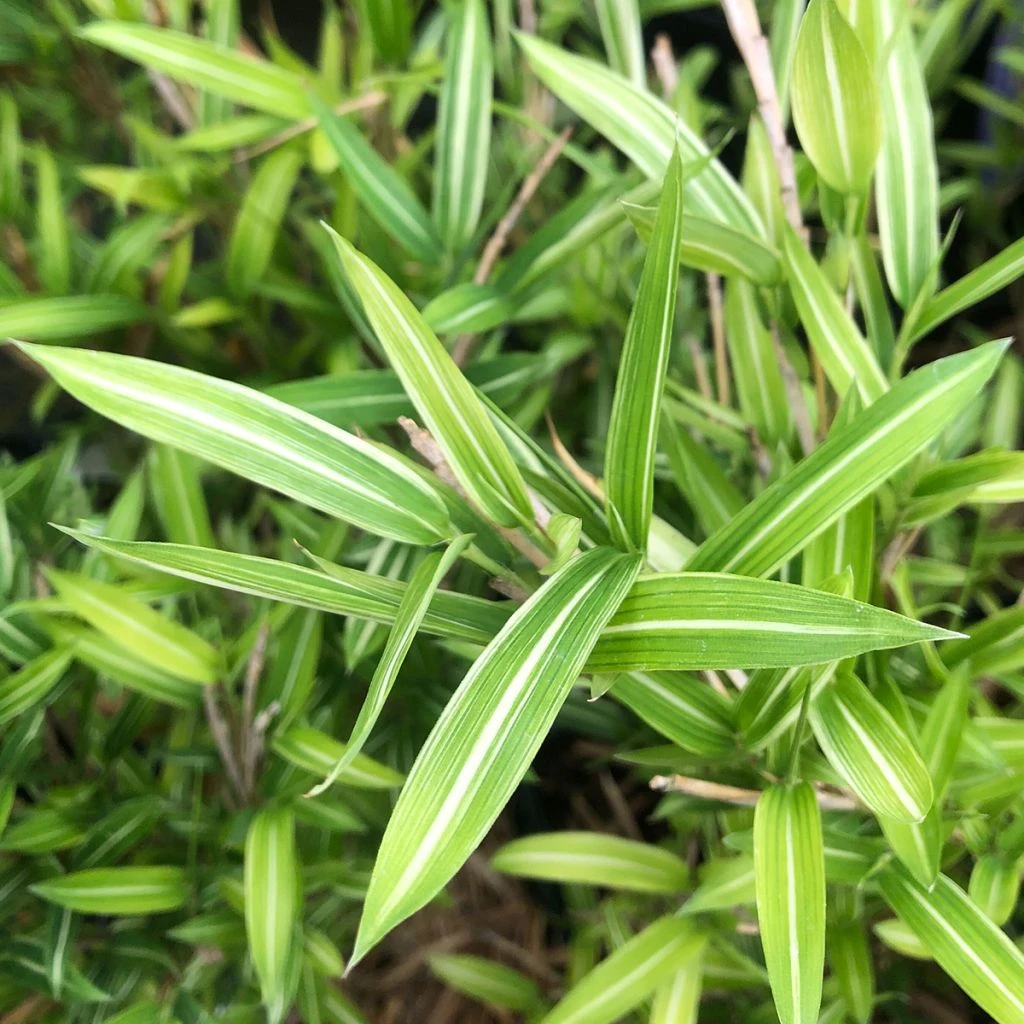 Le Pleioblastus shibuyanus Tsuboi est un bambou au port érigé et touffu, de croissance moyennement rapide. Tout à fait adapté aux hivers rigoureux, il s’agit d’une forme à feuillage panaché d’une espèce originaire du Japon. Comme tous les bambous, il appartient à la famille des Poacées ou graminées. Ce bambou présente des chaumes fins, creux, de couleur vert pâle, d’un diamètre de 2 à 5 mm. Il s’élève jusqu’à 1,5 m, voire 2 m du sol. La plante s’étend plus ou moins lentement par le biais de ses rhizomes traçants sur environ 3,5 m au sol. Les chaumes se ramifient en branches fines, longues et dressées, garnies de nombreuses feuilles de taille moyenne. Son feuillage persistant est très fourni. Il est composé de feuilles pubescentes sur les 2 faces, mesurant 12 à 18 cm de long pour 2 à 4 cm de large. Elles sont d’un vert clair, plus ou moins parcourues de stries blanc-crème, un coloris qui est accentué si la plante est exposée au soleil. Ce bambou se prête bien à la taille, qui accentue encore son élégance naturelle.